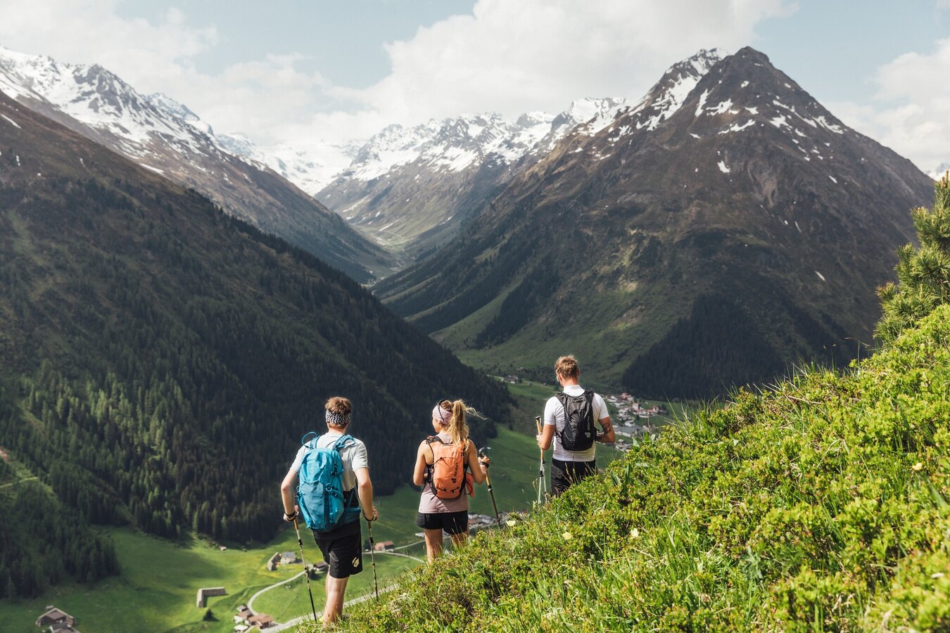 Mit 3,5 Stunden Gehzeit ist Etappe 5 die gemütlichste unter den 9 Etappen. Dennoch gilt es 850 Höhenmeter zu überwinden, bevor man das Etappenziel, die Friedrichshafener Hütte, erreicht. Vom Dorfzentrum Galtür geht es Richtung Ortsteil Außertschafein auf 1.560 m und von hier folgt man der Beschilderung Richtung Friedrichshafener Hütte. Recht anspruchsvoll wurde dieser Weg vom Amt der Tiroler Wildbach- und Lawinenverbauung angelegt. An zwei Stationen sind Informationstafeln angebracht, welche über Vegetation, Forstwirtschaft sowie Verbauungsmaßnahmen informieren. Ab diesem Abschnitt befindet man sich in dem Gebirge der Verwallgruppe von der man einen Panoramablick auf die schon begangene Samnaungruppe auf der gegenüberliegenden Talseite erfolgreich genießen kann. Nachdem man den Grat des Adamsbergs auf ca. 2.330 m passiert hat, führt der Weg leicht bergab über die Flanke der Hohen Köpfe bis zur Friedrichshafener Hütte, die auf 2.138 m liegt.